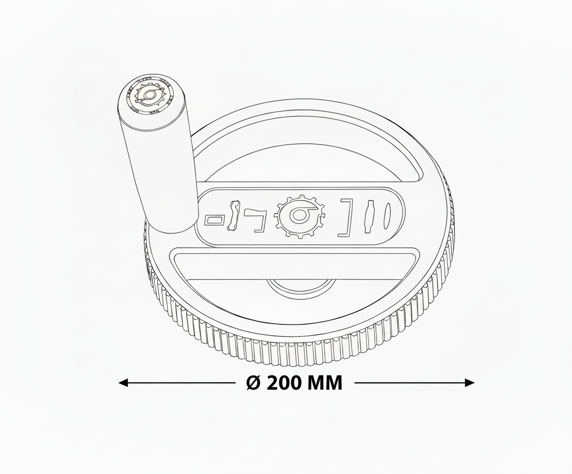 With a 200 outer diameter, it provides optimal torque for manual adjustments, while the 24mm central bore ensures compatibility with standard control shafts. The integrated revolving handle allows for continuous, smooth rotation, significantly reducing operator fatigue during repetitive tasks.